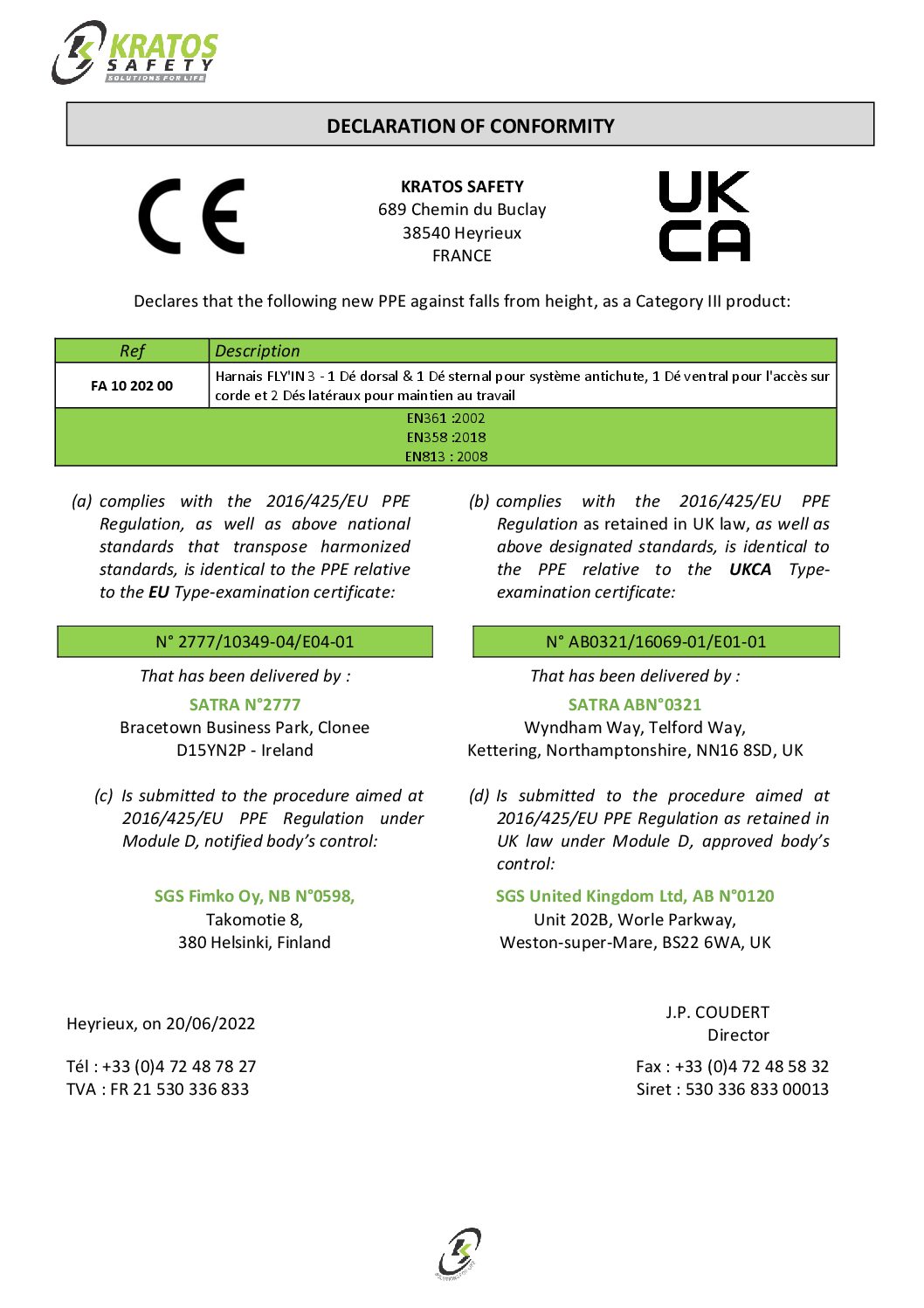 Samsvar – Oppfyller EN 361:2002, EN 358:2018 og EN 813:2008