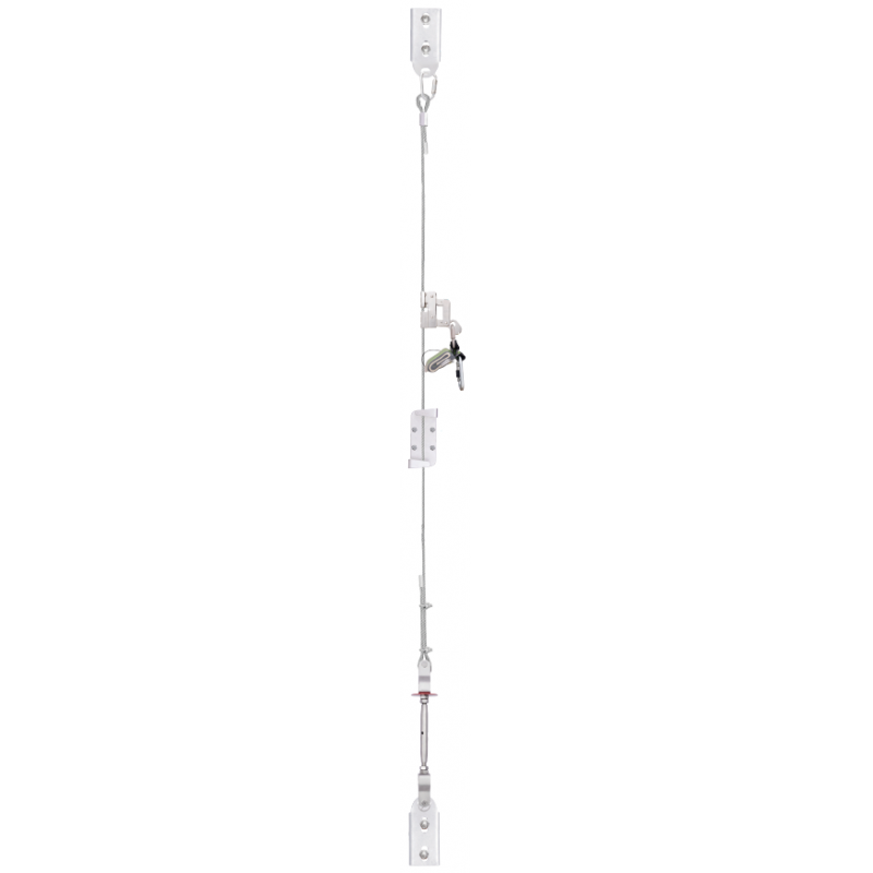 Den høye buede forlengelsen, som skal installeres på toppen av skinnen, over arbeidsplattformen, gjør at brukeren kan kobles til glideren til de har nådd arbeidsområdet, for mer sikkerhet.